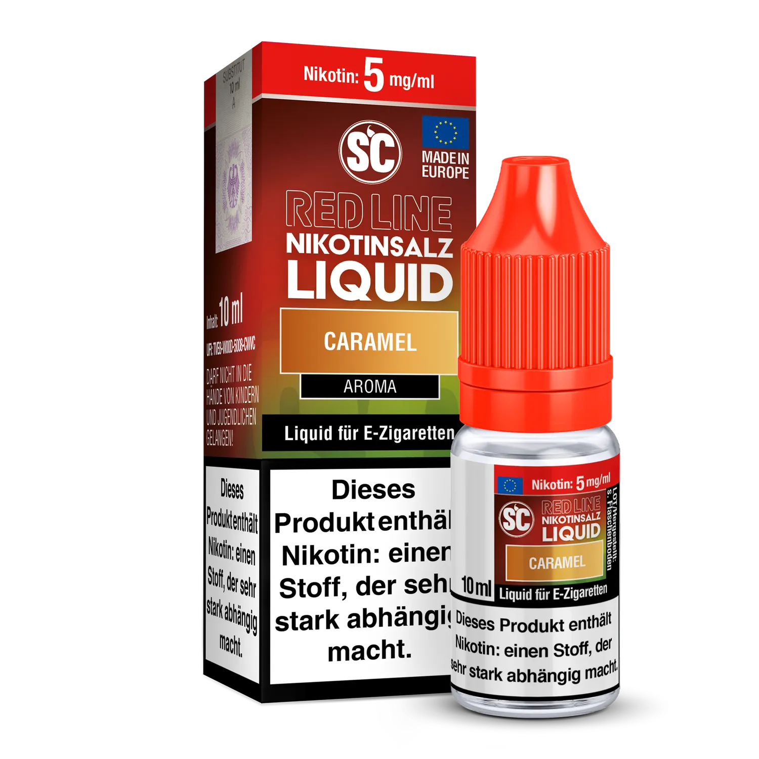 SC - Red Line - Caramel - Nikotinsalz Liquid besteht aus einem 10ml Eliquids mit Nikotinsalz. Die Nikotinsalzstufen bestehen aus 0mg, 5mg, 10mg und 20mg.